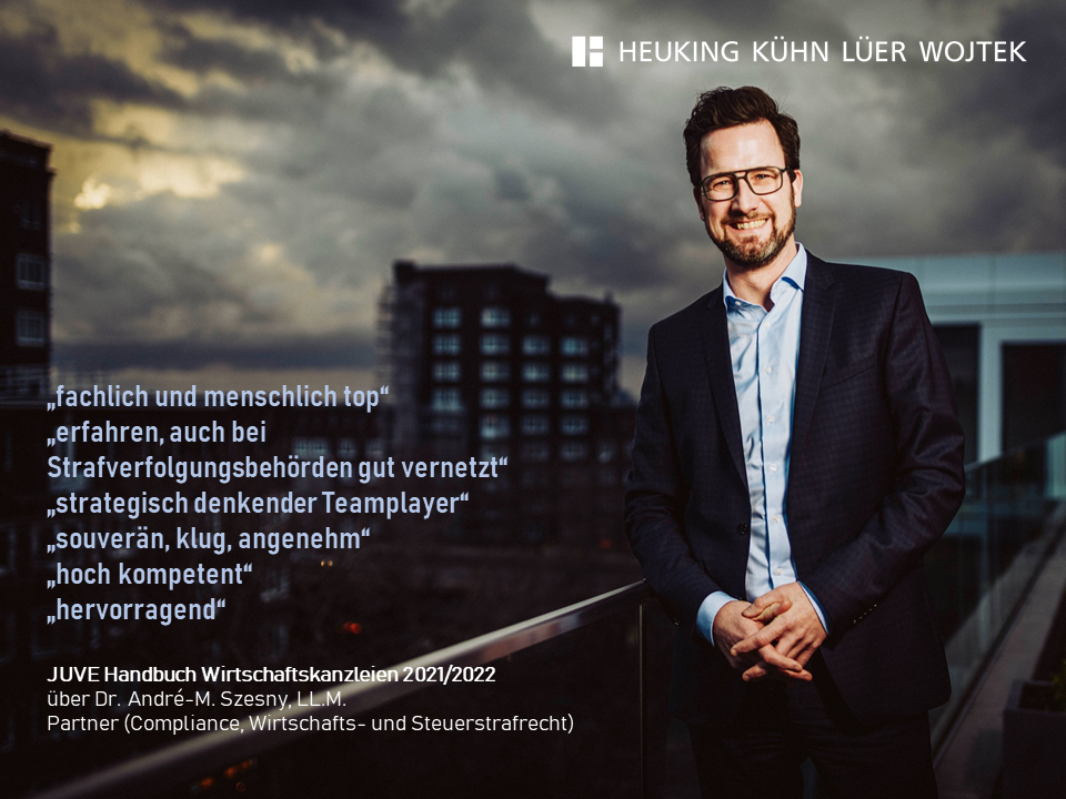 Dr. André-M. Szesny, LL.M. ist auf Wirtschafts- und Steuerstrafrecht sowie Compliance spezialisiert und leitet die entsprechende Praxisgruppe. Er wird regelmäßig von renommierten Branchendiensten wie JUVE, WirtschaftsWoche, Chambers und Legal 500 als Top-Anwalt ausgezeichnet.
