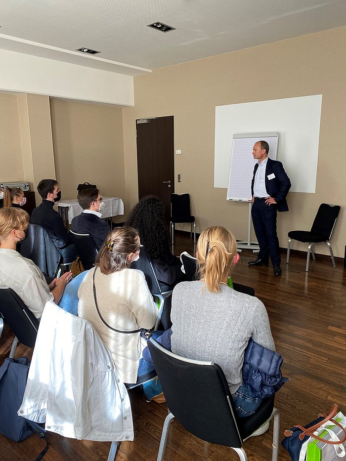 Die Heuking Anwälte Dr. Helge-Torsten Wöhlert aus München sowie Dr. Patrick Müller, LL.M. (University of the West of England, Bristol) aus Düsseldorf gaben den Teilnehmenden einen umfassenden Einblick in die Kanzlei Heuking Kühn Lüer Wojtek, in die Einstiegs- und Karrieremöglichkeiten sowie die Aktivtäten unseres French Desk.