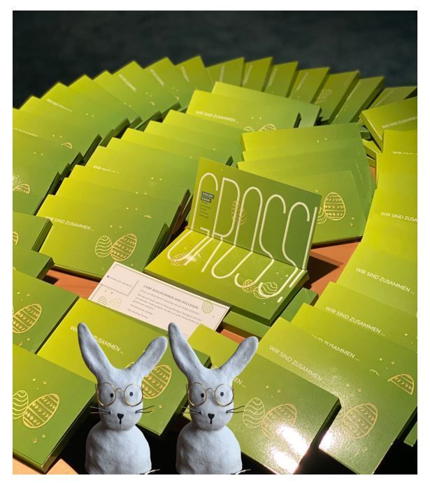 Der Frühling klopft an, die Osterglocken blühen, die Ostereier sind bunt gefärbt und im Garten versteckt. Auch dieses Jahr bereitet der Osterhase unseren Mitarbeitern mit einem süßen Ostergruß eine Freude.