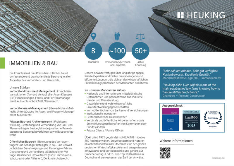 1971 gegründet ist HEUKING mit etwa 450 Rechtsanwälten, Steuerberatern und Notaren an acht Standorten in Deutschland eine der großen deutschen Wirtschaftskanzleien mit ausgewiesener Innovations- und Vertriebsstärke und gehört laut Branchenverlag JUVE zu den Top 10 Kanzleien in Deutschland, gemessen an der Zahl der Anwälte.