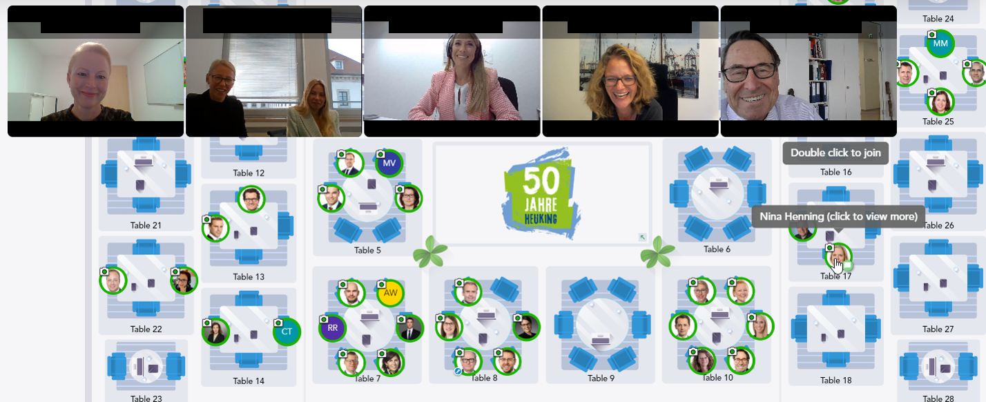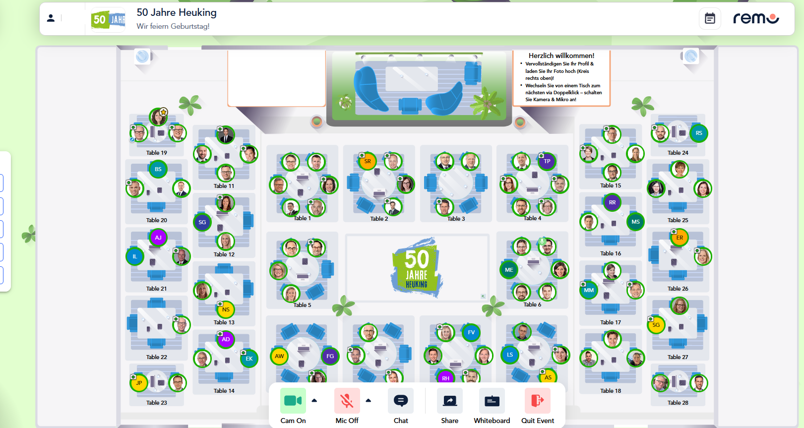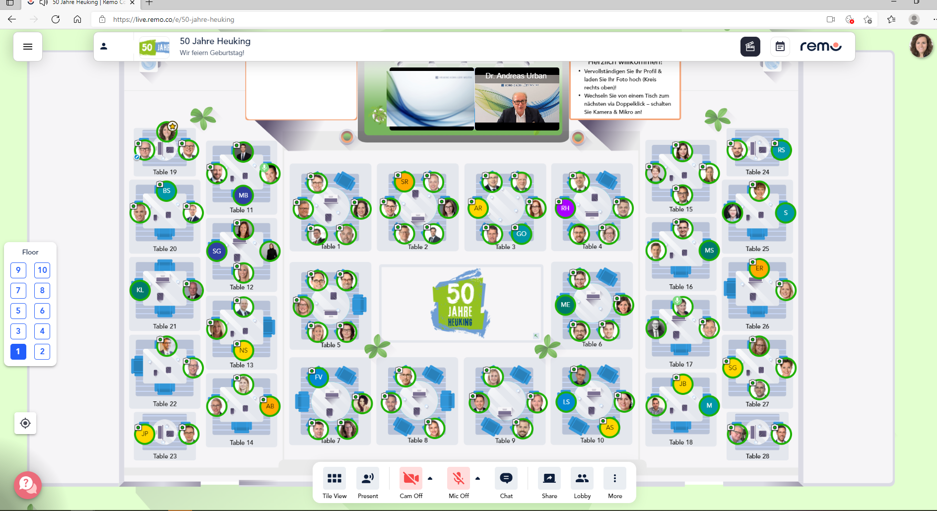 Dr. Andreas Urban, Managing Partner bei Heuking Kühn Lüer Wojtek, begrüßte zu Beginn der Geburtstagsparty alle Teilnehmer und fasste rückblickend die wichtigsten Meilensteine der Kanzleigeschichte zusammen und vergaß den Blick in die Zukunft nicht. Anschließend konnten sich alle Teilnehmer via Laptopkamera und Mikrofon virtuell unterhalten. Der Chatraum bestand aus Tischen, die sich auf mehreren Ebenen befanden. So hatte jeder Kanzleimitarbeiter die Möglichkeit, unkompliziert von Tisch zu Tisch wechseln und immer neue Gesprächspartner kennenzulernen. Langeweile kam dabei keine auf, denn für Gesprächsstoff sorgte ein Gewinnspiel, bei dem ein iPad Pro 11 mit Apple Pencil und Smartkeyboard verlost wurde. Dabei musste eine Gewinnspielkarte mit den Namen der Gesprächspartner ausgefüllt werden, die bestimmte Kriterien erfüllen, wie z. B. das Beherrschen einer seltenen Sprache.