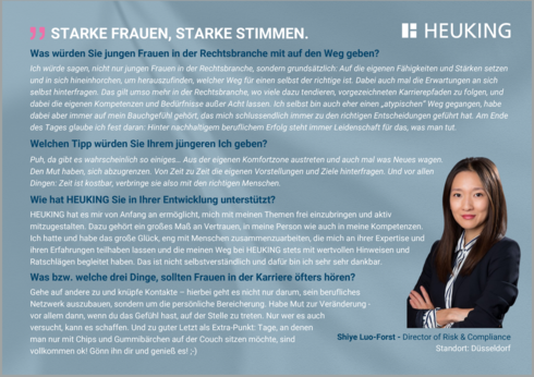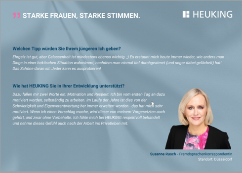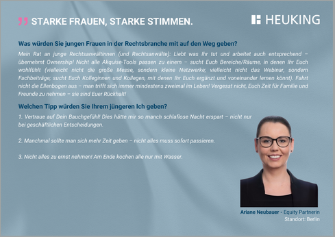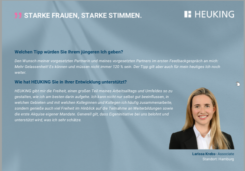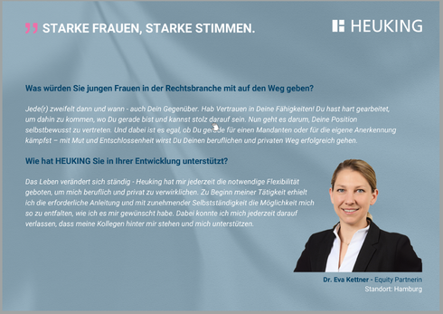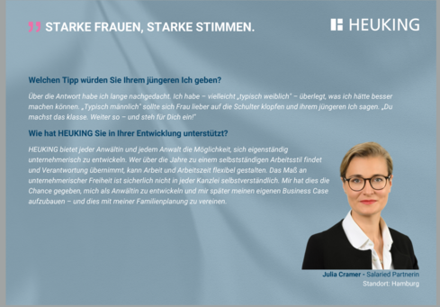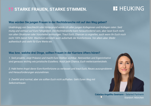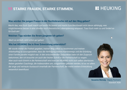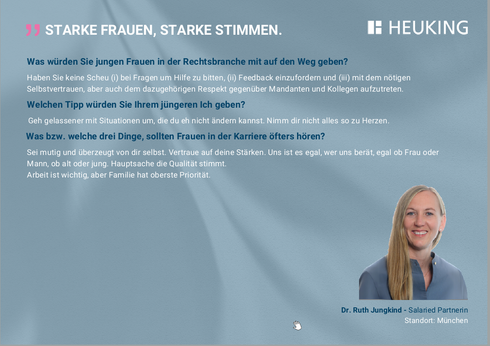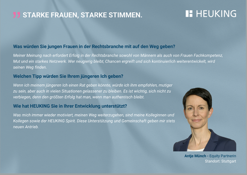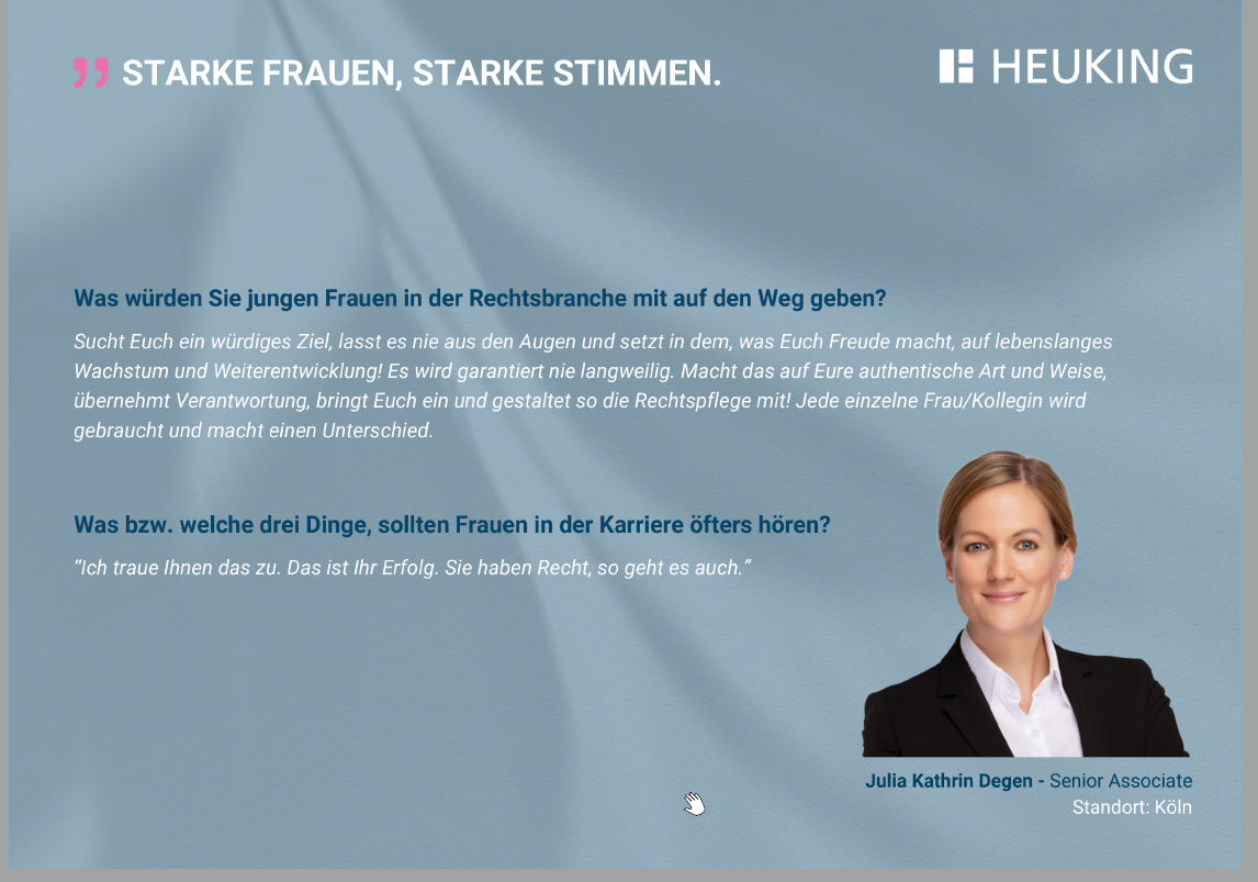 Auch wir bei HEUKING haben diesen Anlass genutzt, um die Frauen in unserer Kanzlei in den Mittelpunkt zu stellen. In den vergangenen Tagen haben wir deshalb auf unseren Social-Media-Kanälen sowie im HEUKING Intranet eine besondere Beitragsreihe veröffentlicht. Jeden Tag stellten wir eine unterschiedliche Kollegin vor, die kurz ihre Perspektiven, Erfahrungen und Gedanken zu Karrierewegen, Herausforderungen und Chancen teilt. Damit möchten wir nicht nur inspirieren, sondern auch zeigen, wie vielfältig und engagiert die Frauen bei HEUKING sind.