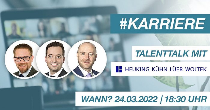 Am 24. März 2022 fand der TalentTalk in Kooperation mit JurCase in Form eines Webinars statt. Alexander Bangert, Gründer von JurCase, führte durch den gemeinsamen Abend und die Heuking Kollegen Tim Petermann, Dr. Marcus Georg Tischler und Dr. Lutz Martin Keppeler gaben den interessierten Nachwuchsjuristen einen Einblick in ihren Werdegang, wie sie zu ihren Praxisgruppen gekommen sind und wie ihr Arbeitsalltag aussieht. In lockerer Atmosphäre hatten die Teilnehmer Zeit, ihre Fragen zu den Themen Bewerbung, Einstieg- und Karrieremöglichkeiten zu stellen und die drei Heuking Anwälte standen Rede und Antwort.