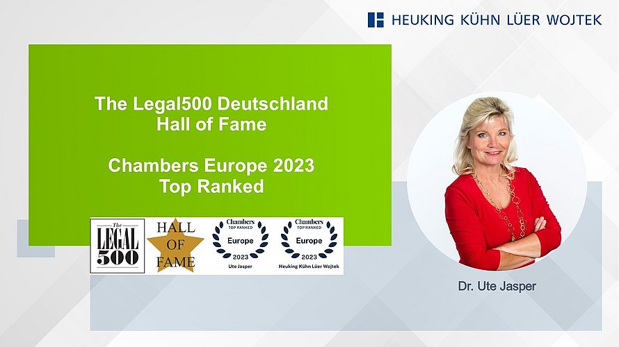 Dr. Ute Jasper ist eine der bekanntesten Anwältinnen für Vergabe- und Infrastrukturprojekte der öffentlichen Hand. Sie berät Bundes- und Landesministerien, Kommunen und Unternehmen, besonders bei innovativen und komplexen Projekten. Ute Jasper leitet das Dezernat „Öffentlicher Sektor und Vergabe“ von Heuking Kühn Lüer Wojtek. Sie hält seit Jahren Rang 1 im Ranking Vergaberecht des JUVE Handbuchs Wirtschaftskanzleien 2017/2018 und ist laut „Kanzleien in Deutschland“ für Infrastruktur die „erste Adresse am Markt“. Im Oktober 2016 wurde sie mit ihrem Team mit dem JUVE Award für Regulierte Industrien ausgezeichnet.