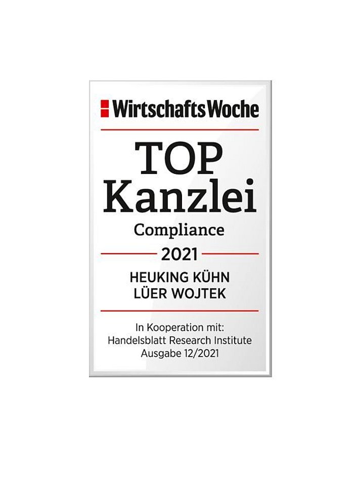 Die WirtschaftsWoche hat in ihrer aktuellen Ausgabe unter dem Titel „Staatsanwalts Lieblinge“ Dr. Susanne Stauder und Dr. André-M. Szesny, LL.M. als Top-Anwälte im Bereich Compliance ausgezeichnet. Heuking Kühn Lüer Wojtek wurde erneut unter die Top-Kanzleien für Compliance gewählt.