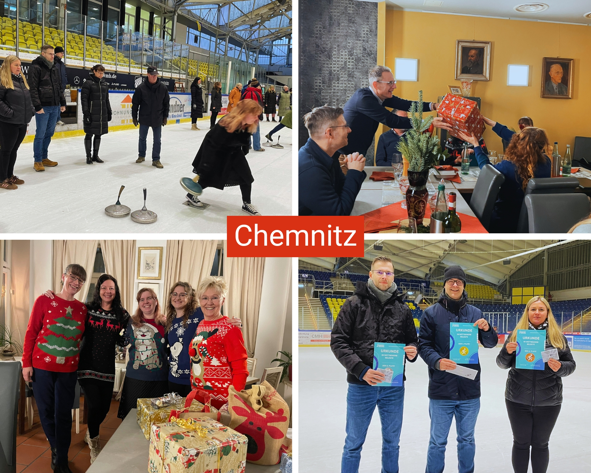 Ebenfalls am 18. Dezember feierte Chemnitz. Die Feier begann sportlich mit Eisstockschießen im Jutta-Müller-Eissportzentrum, bevor es zum gemeinsamen Abendessen in Ronny’s Restaurant ging. Für gute Laune sorgte das traditionelle Schrottwichteln, bei dem die „schönsten“ Geschenke heiß umkämpft waren. Die Stimmung war fröhlich und ausgelassen.