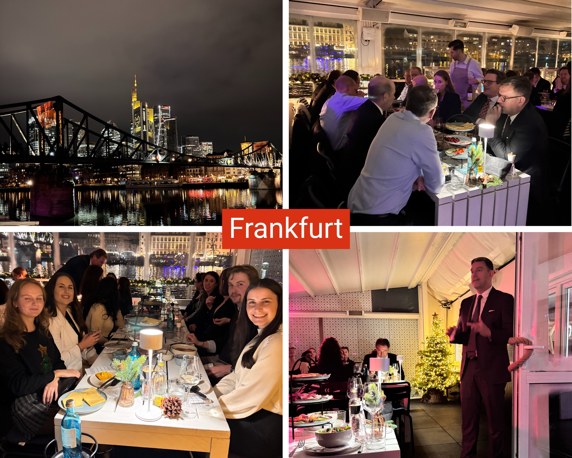 Frankfurt lud ins Freigut – eine exklusive Eventlocation auf dem Wasser mit Blick auf die Skyline. Ein Empfang mit Glühwein und ein leckeres Raclette schufen eine angenehme Atmosphäre für geselliges Beisammensein. Alle genossen den Abend und tanzten bis in die späten Nachtstunden.