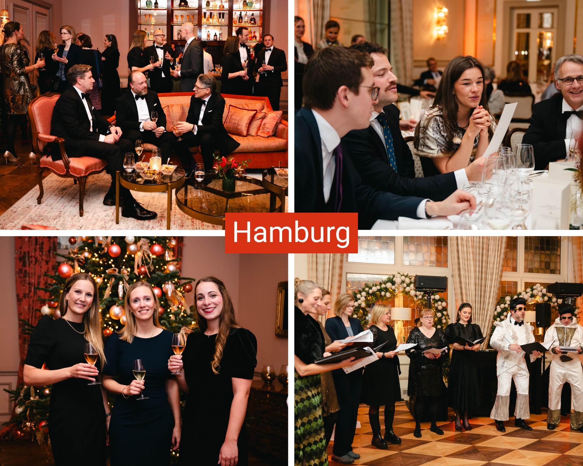 Auch Hamburg feierte am selben Abend im festlich dekorierten Hotel Vier Jahreszeiten. 124 Gäste starteten um 18 Uhr mit einem Begrüßungsdrink. Nach der Rede von Dr. Michael Dröge überraschte ein Chor mit einer besonderen Verkleidung. Anschließend gab es Essen, Drinks und Tanz bis in die frühen Morgenstunden. Ein Tischkicker sorgte zusätzlich für Spaß – die Feier endete um 2 Uhr.