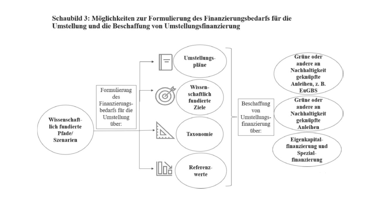 Zunächst wird in den Empfehlungen der Begriff der Umstellungsfinanzierung (transition finance) definiert. Umstellungsfinanzierung bedeutet eine Finanzierung von Investitionen, die mit der Umstellung vereinbar sind und zu ihr beitragen. Umstellung (transition) bedeutet – verkürzt - die Umstellung gegenwärtiger Klima- und Umweltleistungen auf eine klimaneutrale, klimaresistente und ökologisch nachhaltige Wirtschaft in einem Zeitrahmen, in dem das Ziel der Begrenzung des weltweiten Temperaturanstiegs auf 1,5 °C und das durch die EU festgelegte Ziel der Klimaneutralität bis 2050 und der Verringerung der Treibhausgasemissionen um 55 % bis 2030, das Ziel der Anpassung an den Klimawandel sowie andere Umweltziele der Union gemäß der EU Taxonomie nämlich Vermeidung und Verminderung der Umweltverschmutzung, Schutz und Wiederherstellung der Biodiversität und der Ökosysteme, nachhaltige Nutzung und Schutz von Wasser- und Meeresressourcen und Umstellung auf Kreislaufwirtschaft erreicht werden.