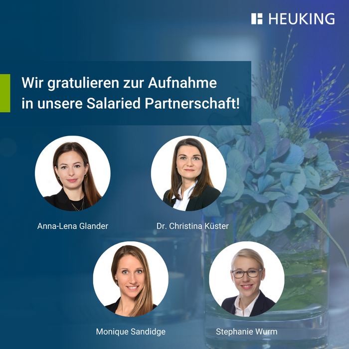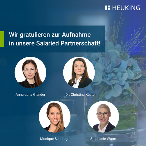 Effective July 1, 2024, HEUKING will promote four Senior Associates to Salaried Partners: Anna-Lena Glander from the Düsseldorf office, Dr. Christina Küster from Hamburg, Monique Sandidge from Frankfurt, and Stephanie Wurm from the Munich office.